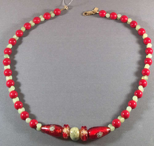 In a stunning color combination of cherry red and jade green, this beaded necklace is sure to add charm to your jewelry collection. Featuring jade and ceramic beads around a center design of Lampwork beads. Finished with a gold-filled Lobster claw clasp closure. What a charmer!
